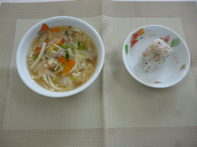 今日の給食は、「あんかけうどん」と「じゃこおにぎり」 おやつは、「牛乳」と「お楽しみおやつ」です。