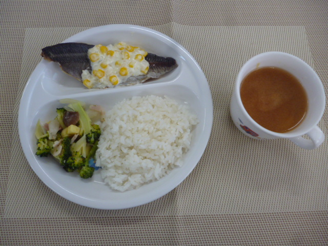 今日の給食は、「あじのマヨネーズ焼き」、「ブロッコリーとさつまいものソテー」と「豆腐のみそ汁」 おやつは、「牛乳」、「柿」と「ぽたぽた焼」です。