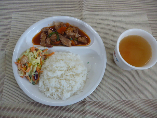 今日の給食は、「ポークチャップ」、「ひよこ豆のサラダ」と「コンソメスープ」 おやつは、「牛乳」、「豆乳あべかわ」と「ハッピーターン」です。