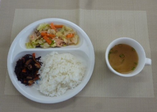 今日の給食は、「鮭のちゃんちゃん焼き」、「大豆とひじきの炒め煮」と「豆腐のすまし汁」 おやつは、「牛乳」、「マシュマロサンド」と「こんぶ」です。