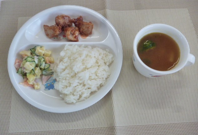 令和3年12月3日(金)の献立 2021/12/03 今日はお誕生日会です🍰 12月生まれのお友達、お誕生日おめでとう✨ 今日の給食は、「鶏肉のケチャップ和え」、「さつま芋のサラダ」と「カレースープ」 おやつは、「牛乳」、「ブラウニー」と「動物ビスケット」です。