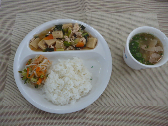 今日の給食は、「高野豆腐とひき肉の煮物」、「大根の酢の物」と「白菜のみそ汁」 おやつは、「牛乳」、「オレンジ」と「源氏パイ」です。