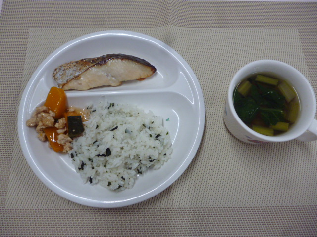 令和3年12月7日(火)の献立 2021/12/07 今日の給食は、「わかめごはん」、「さわらのごま照り焼き」と「かぼちゃのそぼろあんかけ」と 「小松菜のすまし汁」 おやつは、「牛乳」と「大学芋」です。