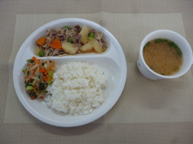 今日の給食は、「肉じゃが」、「チンゲン菜のナムル」と「厚揚げのみそ汁」