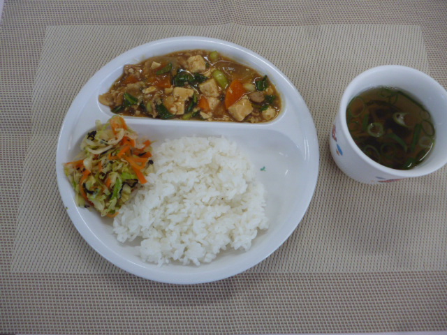 今日の給食は、「豆腐のカレーあん」、「キャベツの磯和え」と「わかめのすまし汁」 おやつは、「牛乳」と「コーンマヨトースト」です。