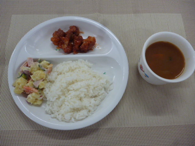 今日の給食は、「鶏肉のケチャップ和え」、「さつま芋のサラダ」と「カレースープ」
