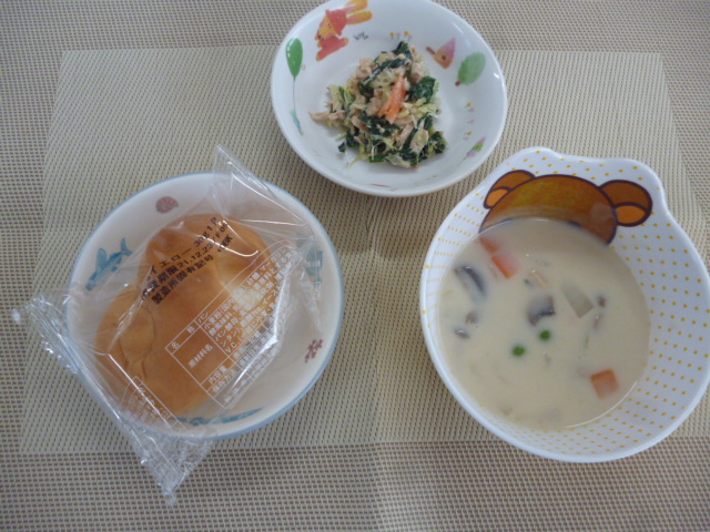 今日の給食は、「ロールパン」、「クリームシチュー」と「ほうれん草とツナのサラダ」 おやつは、「牛乳」と「大学芋」です。