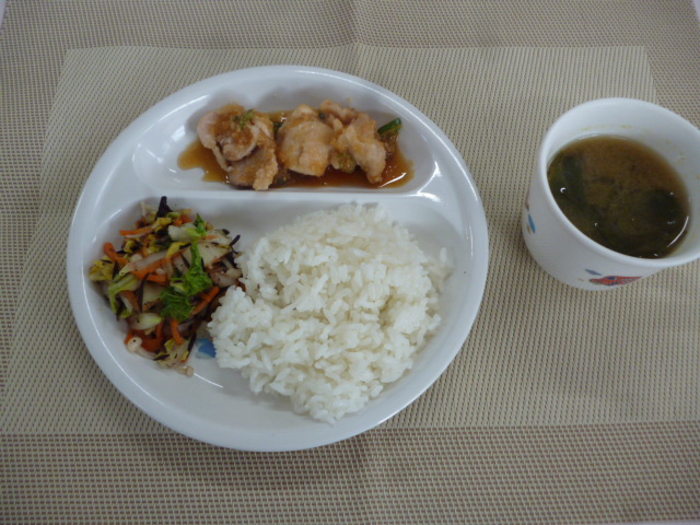 今日の給食は、「鶏肉のレモン醤油焼き」、「白菜とひじきのおかか和え」と「ほうれん草のみそ汁」