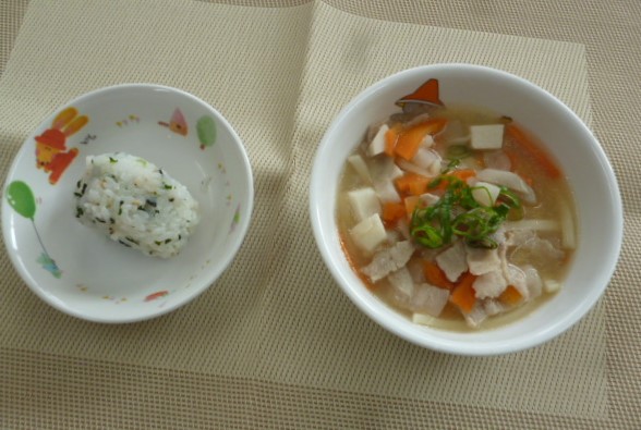 今日の給食は、「豚汁うどん」と「菜飯おにぎり」 おやつは、「牛乳」と「お楽しみおやつ」です。