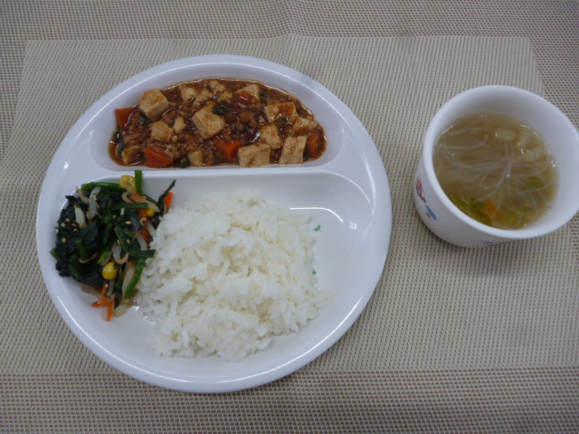 今日の給食は、「麻婆豆腐」、「ほうれん草のナムル」と「白菜の中華スープ」 おやつは、「牛乳」、「オレンジ」と「きなこ餅せんべい」です。