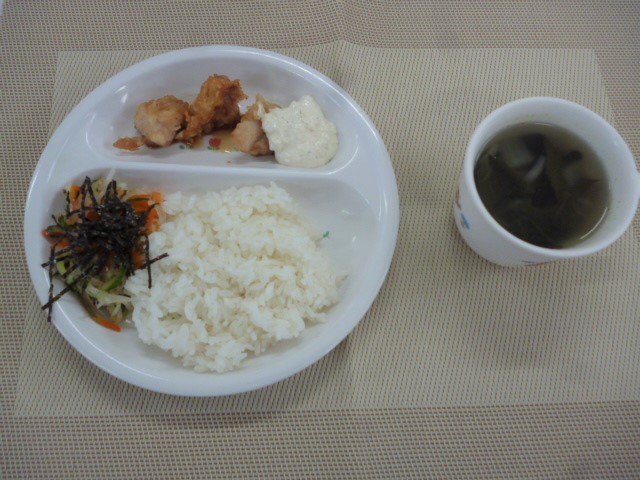 今日の給食は、「チキン南蛮」、「大根サラダ」と「野菜スープ」 おやつは、「牛乳」と「ココアホットケーキ」です。