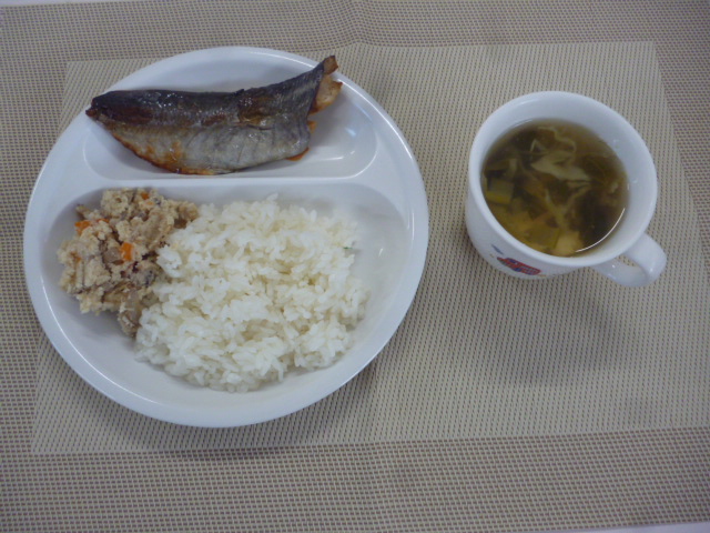 今日の給食は、「あじのバター醤油焼き」、「卯の花炒り」と「キャベツのすまし汁」 おやつは、「牛乳」、「きなこ団子」と「ぽりぽり小魚」です。