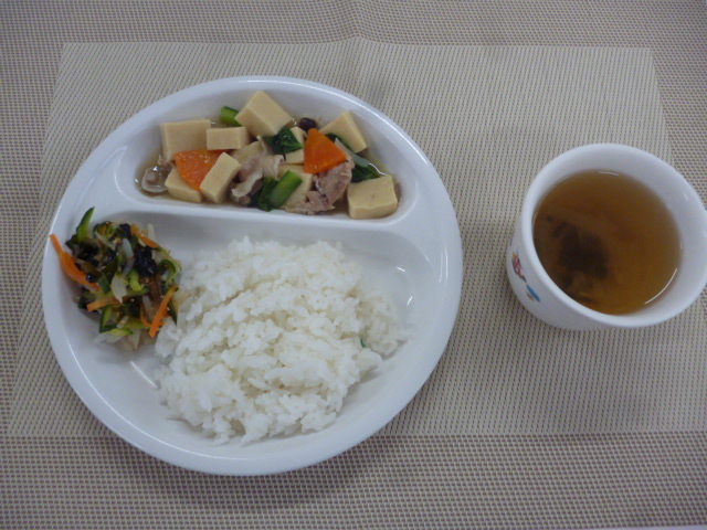 今日の給食は、「高野豆腐の中華炒め煮」、「もやしの酢の物」と「玉ねぎのすまし汁」