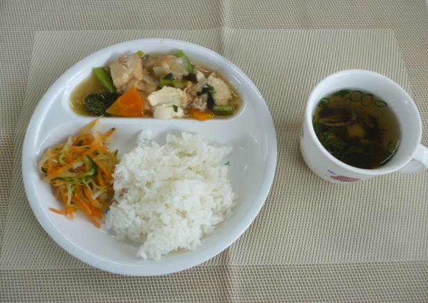 今日の給食は、「厚揚げの野菜あんかけ」、「大根のナムル」と「わかめのすまし汁」 おやつは、「牛乳」、「ココアミルク寒天」と「ソフトせんべい」です。