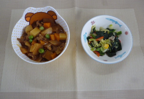 今日の給食は、「カレーライス」と「ほうれん草とコーンのソテー」