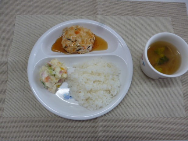 今日の給食は、「鶏つくねの照り焼き」、「ポテトサラダ」と「野菜スープ」