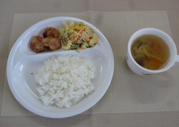 今日の給食は、「ハニースパイシーチキン」、「マカロニサラダ」と「野菜スープ」