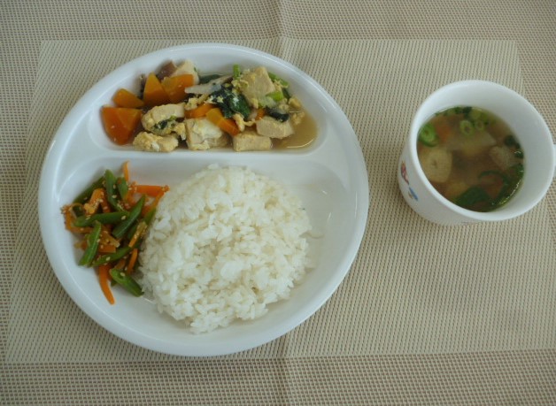 今日の給食は、「高野豆腐のふわふわ煮」、「いんげんのごまみそ和え」と「けんちん汁」 おやつは、「牛乳」と「ラスク」です。