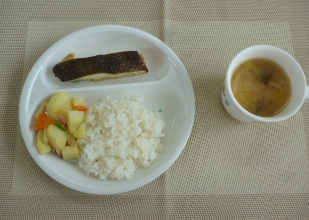 令和4年4月13日(水)の献立 2022/04/13 今日の給食は、「白身魚の磯辺焼き」、「じゃが芋のカレーソテー」と「厚揚げのみそ汁」 おやつは、「牛乳」、「キャロットゼリー」と「きなこ餅せんべい」です。 ★お昼の「白身魚の磯辺焼き」はカレイで作りました。 ★「じゃが芋のカレーソテー」は新メニューです🍴