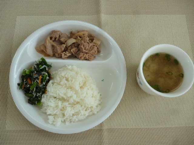 令和4年4月14日(木)の献立 2022/04/14 今日の給食は、「豚肉のしょうが焼き」、「ほうれん草のしらす和え」と「なすのみそ汁」 おやつは、「牛乳」、「抹茶マーブル蒸しパン」と「チーズ」です。 ★「ほうれん草のしらす和え」は新メニューです🍴