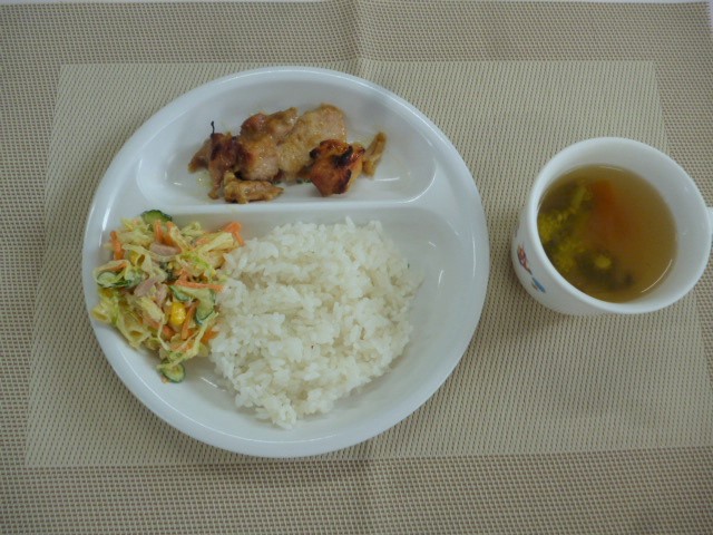 令和4年4月22日(金)の献立 2022/04/22 今日の給食は、「ハニースパイシーチキン」、「マカロニサラダ」と「野菜スープ」 おやつは、「牛乳」、「りんご」と「星たべよ」です。 ★おやつの「雪の宿」は「星たべよ」に変更となりました。