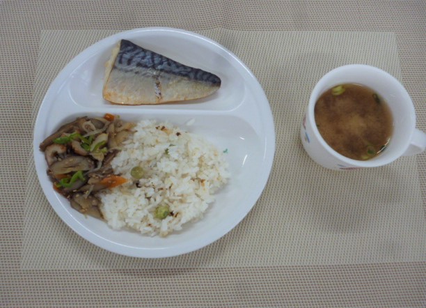 今日の給食は、「豆ごはん」、「さばの塩焼き」、「きんぴらごぼう」と「なすのみそ汁」