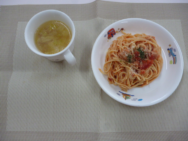 今日の給食は、「ツナとトマトのクリームパスタ」と「チキンスープ」 おやつは、「牛乳」と「お楽しみおやつ」です。