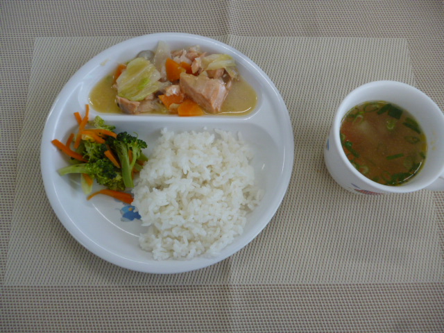 令和4年5月24日(火)の献立 2022/05/24 今日の給食は、「鮭のちゃんちゃん焼き」、「ブロッコリーの和え物」と「大根のすまし汁」 おやつは、「牛乳」、「五平もち」と「ぽりぽり小魚」です。 ★お昼の「白菜の昆布和え」は「ブロッコリーの和え物」に変更となりました。