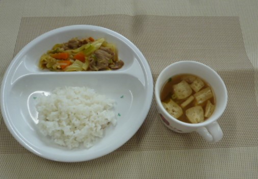 今日の給食は、「豚肉のカレー野菜炒め」と「豆腐のみそ汁」 おやつは、「牛乳」と「お楽しみおやつ」です。