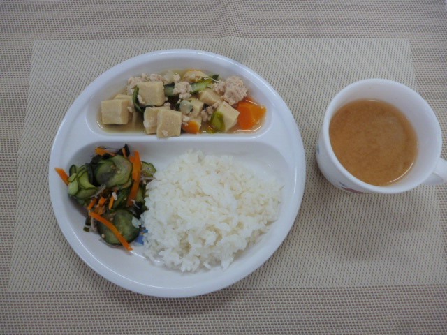 今日の給食は、「高野豆腐のそぼろ煮」、「きゅうりの酢の物」と「キャベツのみそ汁」 おやつは、「牛乳」、「オレンジ」と「ハッピーターン」です。