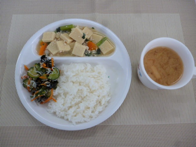 今日の給食は、「高野豆腐のそぼろ煮」、「きゅうりの酢の物」と「キャベツのみそ汁」