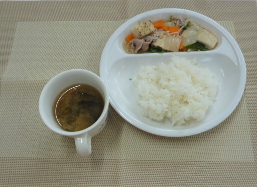 今日の給食は、「豚肉のすき焼き風煮物」と「じゃがいものみそ汁」