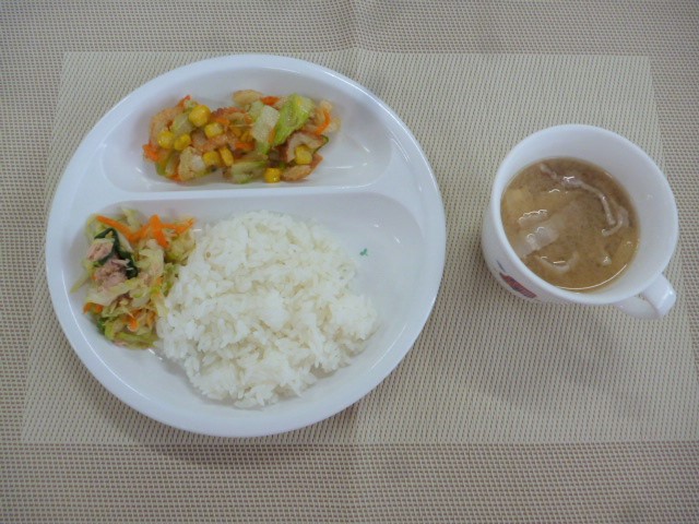 今日の給食は、「アスパラのかき揚げ」、「キャベツとツナのごま和え」と「豚汁」