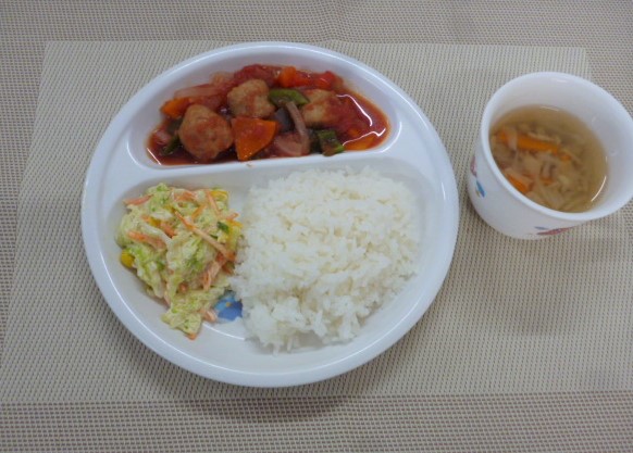 令和4年6月29日(水)の献立 2022/06/29 今日の給食は、「肉団子のトマト煮」、「コールスローサラダ」と「きのこのスープ」 おやつは、「牛乳」、「黒糖蒸しパン」と「チーズ」です。 ★「コールスローサラダ」には、ひかり組さんが栽培・収穫したきゅうりが入っています🥒