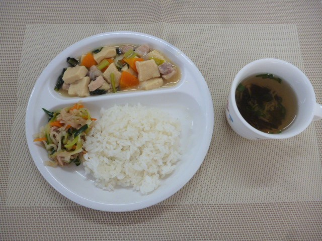 今日の給食は、「高野豆腐の中華炒め煮」、「切干大根とツナの和え物」と「わかめのすまし汁」 おやつは、「牛乳」、「すいか」と「ソフトせんべい」です。