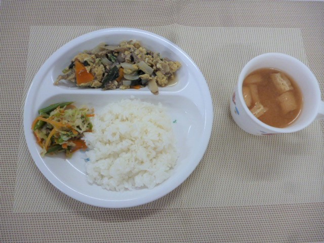 今日の給食は、「豚肉の柳川風煮物」、「いんげんのごま和え」と「もやしのみそ汁」