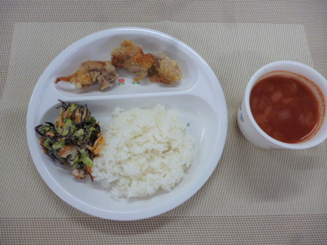 今日の給食は、「鶏肉のパン粉焼き」、「ブロッコリーサラダ」と「ミネストローネ」