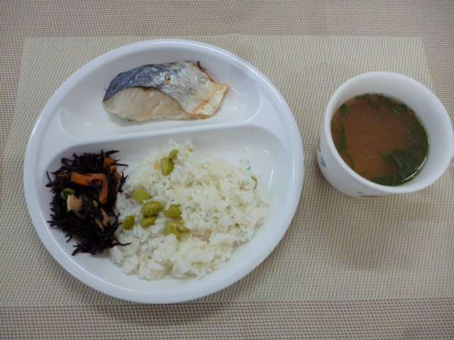 今日の給食は、「えだまめごはん」、「さわらの塩焼き」、「ひじきの炒め煮」と「かぼちゃのみそ汁」 おやつは、「牛乳」と「ヨーグルト蒸しパン」です。