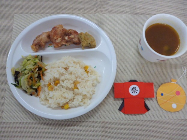 令和4年8月1日(月)の献立 2022/08/01 今日は夏祭りです👘🎇 集まっての開催はなくなりましたが、クラスごとで楽しんでいます! 給食もお祭り風メニューなので、楽しんでくれると嬉しいです😊 今日の給食は、「焼きもろこしごはん」、「鶏のからあげ(付)星形ポテト」、「キャベツの昆布和え」と 「カレースープ」 おやつは、「ジュース」と「お楽しみおやつ」です。