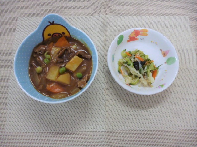 令和4年8月16日(火)の献立 2022/08/16 1号さんはもう少し夏休みですが、今日から通常保育です! 今日の給食は、「カレーライス」と「キャベツの和風サラダ」 おやつは、「牛乳」、「杏仁豆腐風」と「ハッピーターン」です。