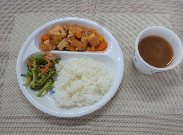 今日の給食は、「厚揚げのケチャップ煮」、「ブロッコリーとツナの和え物」と「もやしのみそ汁」 おやつは、「牛乳」、「モモ缶」と「ぼんち揚げ」です。