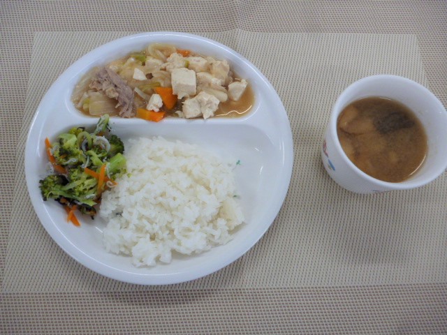 今日の給食は、「肉豆腐」、「ブロッコリーとしらすののり酢和え」と「なすのみそ汁」 おやつは、「牛乳」、「コーン蒸しパン」と「チーズ」です。