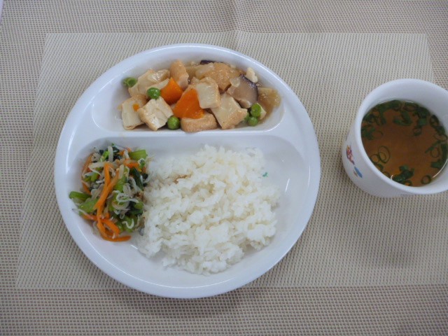 今日の給食は、「厚揚げの甘酢あんかけ」、「小松菜としらすのお浸し」と「麩のすまし汁」