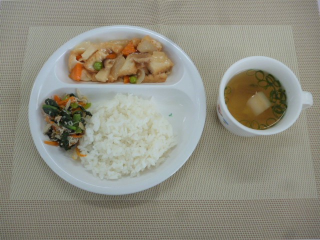 今日の給食は、「厚揚げの甘酢あんかけ」、「小松菜としらすのお浸し」と「麩のすまし汁」
