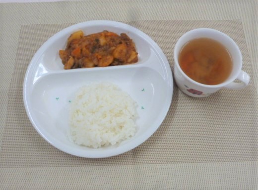 今日の給食は、「牛肉と野菜のケチャップ煮」と「きのこのスープ」 おやつは、「牛乳」と「お楽しみおやつ」です。