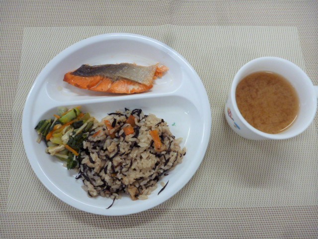 令和4年10月4日(火)の献立 2022/10/04 今日の給食は、「ひじきごはん」、「鮭の塩焼き」、「チンゲン菜とあげの煮浸し」と 「じゃがいものみそ汁」 おやつは、「牛乳」、「お好みマカロニ」と「こんぶ」です。 ★おやつの「お好みマカロニ」は新メニューです🍴
