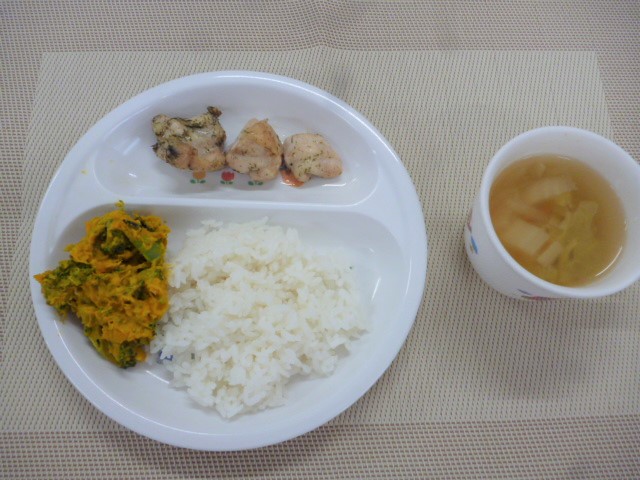 令和4年10月5日(水)の献立 2022/10/05 今日は、お誕生日会です🍰✨ 10月生まれのお友達、お誕生日おめでとう🎃 今日の給食は、「のり塩チキン」、「かぼちゃとブロッコリーのツナサラダ」と「白菜のスープ」 おやつは、「牛乳」、「さつまいものメープルケーキ」と「動物ビスケット」です。 ★「のり塩チキン」、「かぼちゃとブロッコリーのツナサラダ」と おやつの「さつまいものメープルケーキ」は新メニューです🍴