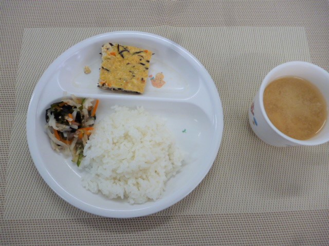 今日の給食は、「擬製豆腐」、「大根の和風和え」と「キャベツのみそ汁」