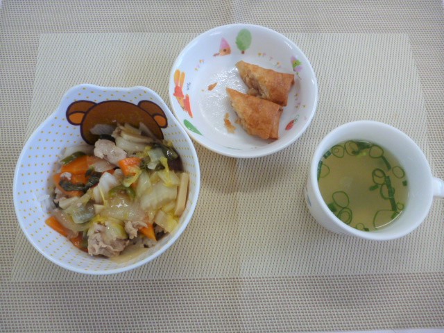 今日の給食は、「中華丼」、「春巻き」と「豆腐スープ」 おやつは、「牛乳」、「オレンジ蒸しパン」と「チーズ」です。