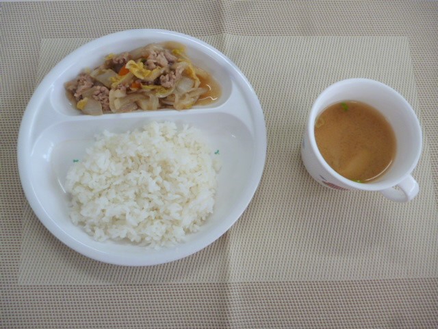 今日の給食は、「すき焼き煮」と「具沢山みそ汁」 おやつは、「牛乳」と「お楽しみおやつ」です。